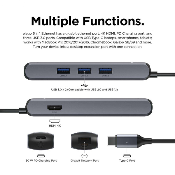 برند الاگو یکی از معتبرترین برندها در زمینه لوازم جانبی است که علاوه بر تمرکز تولید آن بر ظاهر زیبا و شیک آن، به کاربردی بودن اکسسوری ها توجه ویژه ای دارد. این هاب با دارا بودن ۶ خروجی بسیار کاربردی میتواند همراه همیشگی گوشی موبایل سامسونگ یا مک بوک تان باشد که دارای یک پورت 1000M Gigabit Ethernet، یک خروجی HDMI برای Screen Mirror کردن صفحه نمایش بر روی تلویزیون با کیفیت HD و ۳ پورت USB 3.0 (با سرعت انتقال ۱۰ برابر بیشتر از USB 2.0) و یک پورت شارژ PD می باشد. این هاب از جنس آلومینیوم ساخته شده است و وزن سبکی دارد و به راحتی میتوان آن را حمل کرد. این مدل هاب یکی از جدیدترین هابهای برند الاگو است