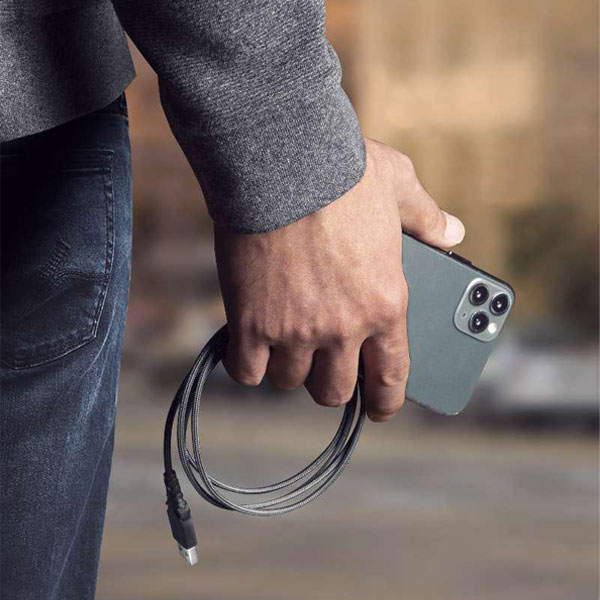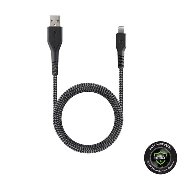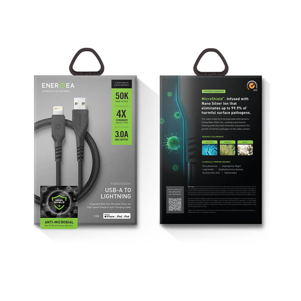 کابل انرژیا مدل فایبرا تاف USB به لایتنینگ ۱.۵ متری روکش شده با مواد آنتی میکروبیال – ضد میکروب – و به همراه نخهای الیاف نرم بافته شده